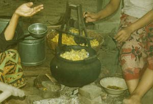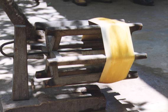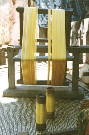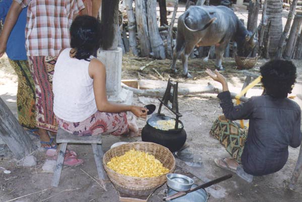 The silk worm is picked when it is about two centimeters long, firm and a rich yellow color. In Phnom Srok, the cooperative which grows the cocoons sells them to the spinners and weavers. These women boil the cocoons and after a few minutes pick up the thread and start to spin it off the cocoons onto a spindle.