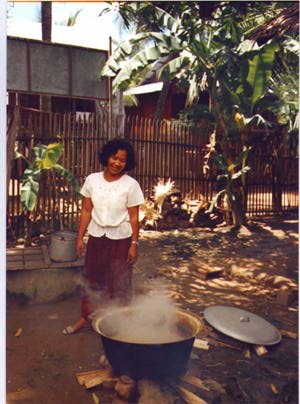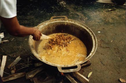 Sopun, master weaver ensures that bark boils for the correct amount of time.