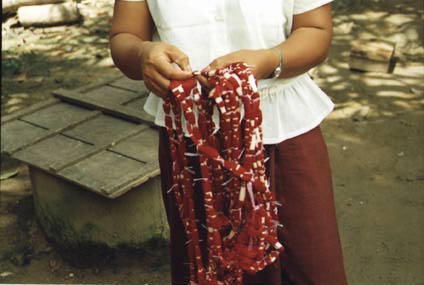 Sopun's hands carefully tie threads of silk together to keep the yellow dye in the ikat pattern she designed. After she has finished tying she soaks the silk thread in the yellow.